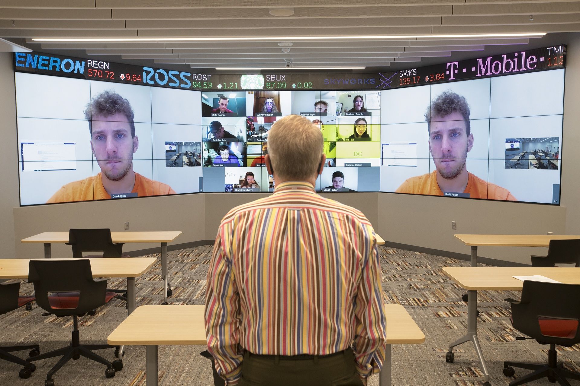 Rush, whose teaching and research focus on stock market concepts, also takes advantage of the digital ticker displayed in the Visualization Lab and in the main stairway of the three-story William F. and Peggy T. Schmeltz Atrium. “The ticker displays in the center walls remind students there is always something happening in the markets,” says Rush. The displays also include news headlines and the college’s social media feeds.